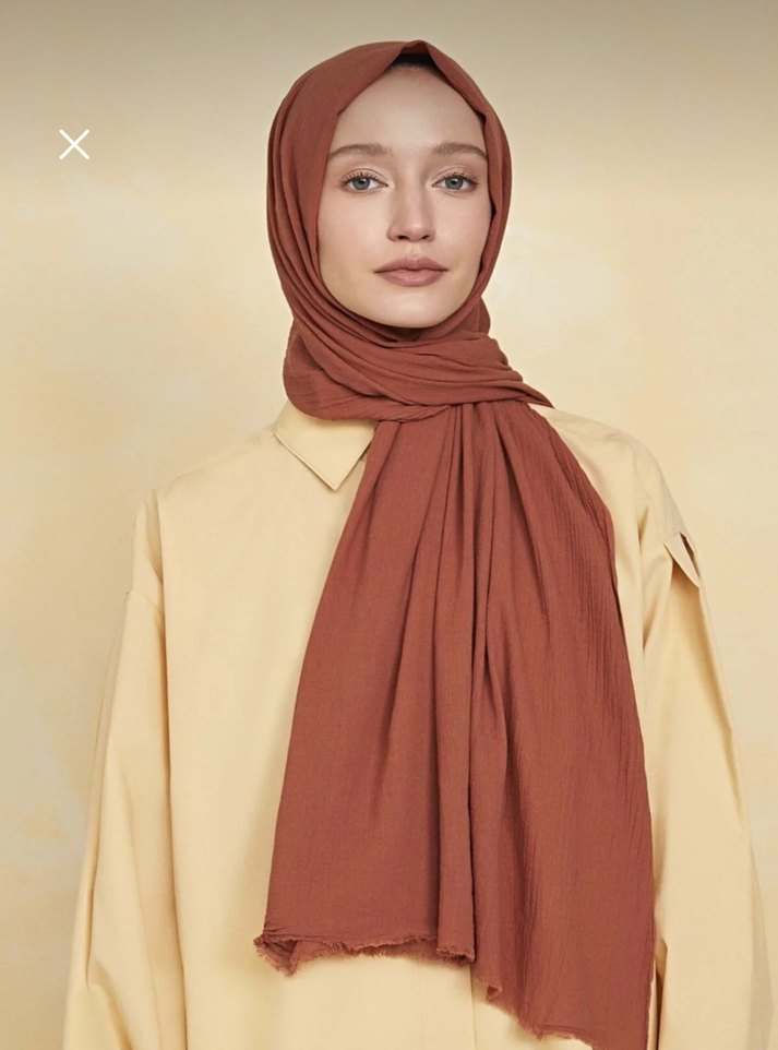 Kadınlar için tasarlanmış, tarçın renkli pamuklu, salaş ve drapeli şal/ eşarp . Minimalist ve sade stil için uygundur.