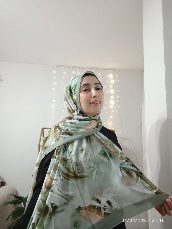 Kadınlar için hafif haki renkte, ipek görünümlü drapeli şal. Mütevazı ve bohem tarzlara uygundur. Fotoğraf zamanı 04/08/2025, 21:10.