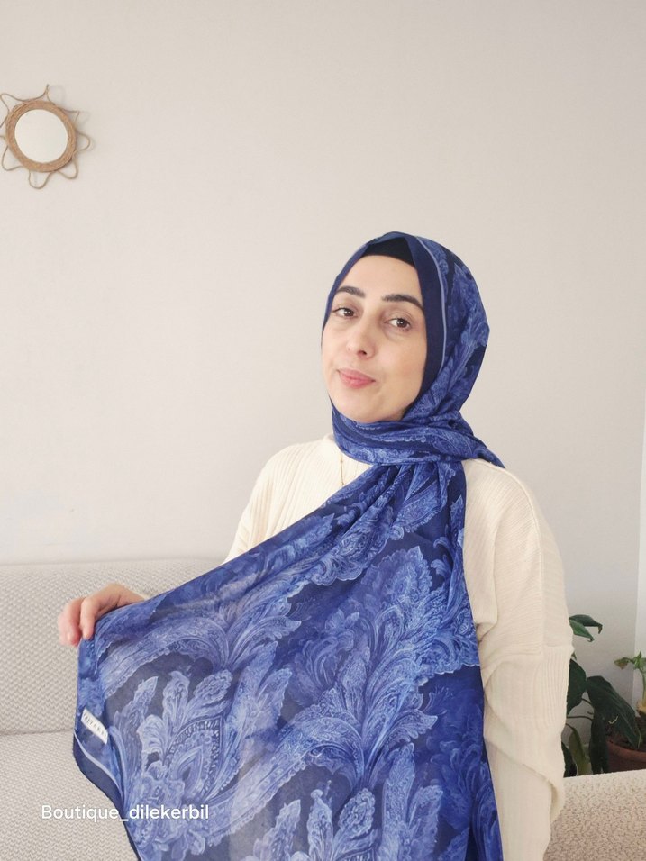 koyu mavi bohem tarzda kadın şal. Yumuşak sentetik kumaştan, modest ve şık görünüm sunar. Üzerinde 'Bouticl' markası bulunur.