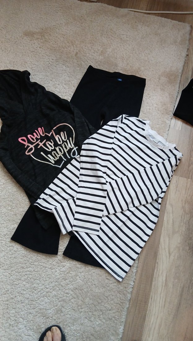 Siyah pamuk kapşonlu tişört, uzun kollu ve bisiklet yaka siyah beyaz çizgili tişört ve siyah hafif İspanyol paça tayt. Rahat, bol kesim ve baskılı tasarımıyla günlük kullanım için konforlu ve şıktır.