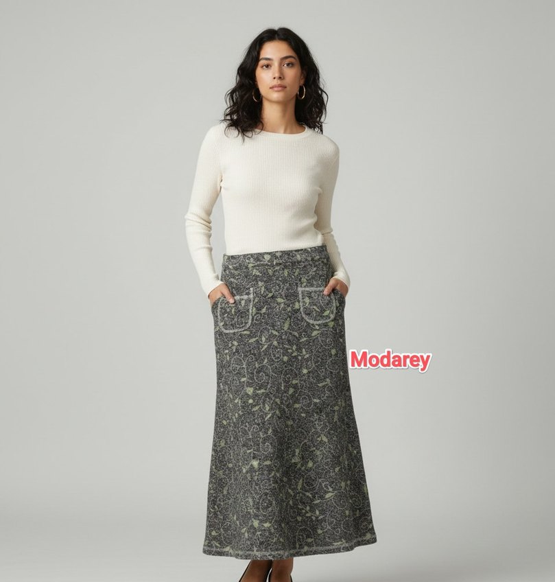 Pamuk-Yün kumaştan, bol kesim uzun etek. Desensiz ve günlük kullanıma uygun cepli, rahat bir model. 2 adet cebi bulunmakta. İçinde astarı vardır. Boyu; 95 cm'dir. Beli; 42 cm'dir. Arkasında fermuar ve düğmesi vardır. 0 üründür. (MARKA TEMSİLİDİR)