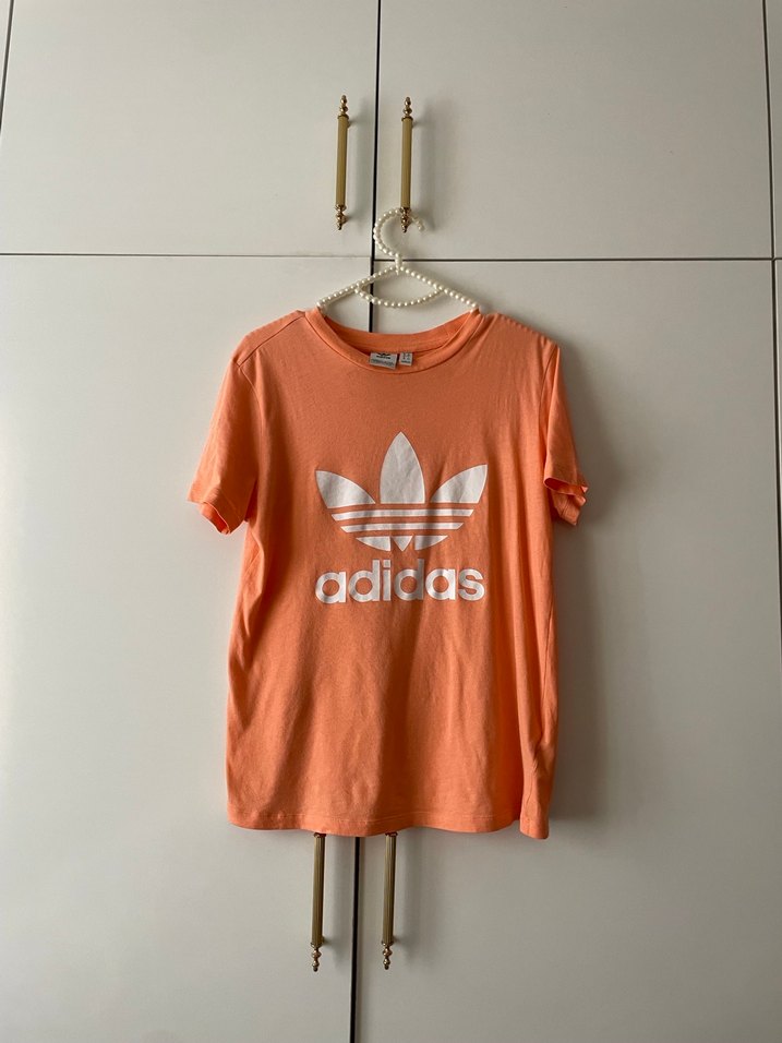 Pamuklu, turuncu renkli, kısa kollu kız tişörtü. Gevşek kesim ve yuvarlak yakalıdır. Önünde 'adidas' baskısı bulunur, rahat ve şık bir sokak stili sunar.