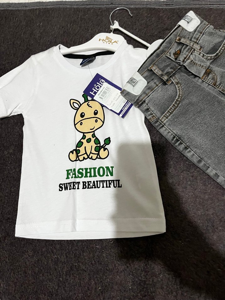 Pamuklu beyaz kısa kollu tişört, üzerinde zürafa baskısı ve "FASHION SWEET BEAUTIFUL" yazısı bulunur. Gri düğmeli pantolonla tamamlanır. Rahat yuvarlak yaka. 1 yaş