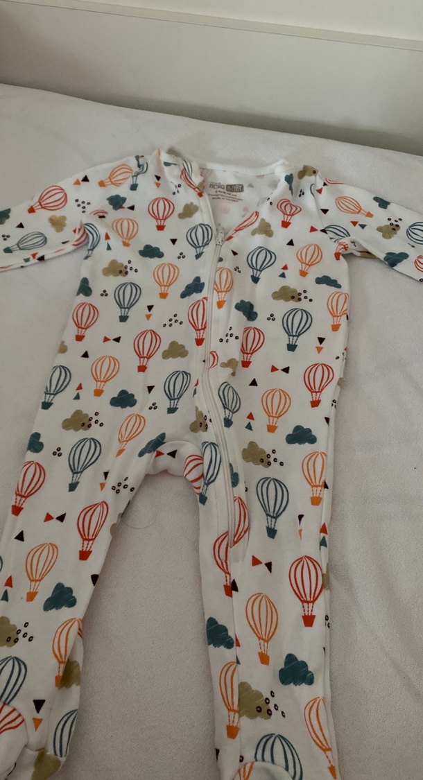 Pamuklu kumaştan, uzun kabarık kollu ve bisiklet yakalı bebek erkek tulumu. Rengarenk sıcak hava balonu baskılı, streetwear tarzında.