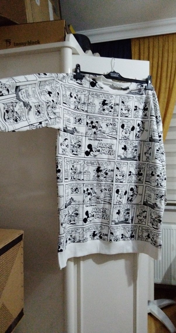 Pamuklu kumaştan, baskılı, siyah beyaz kadın sweatshirt. Uzun kollu, bisiklet yaka, tunik, rahat.