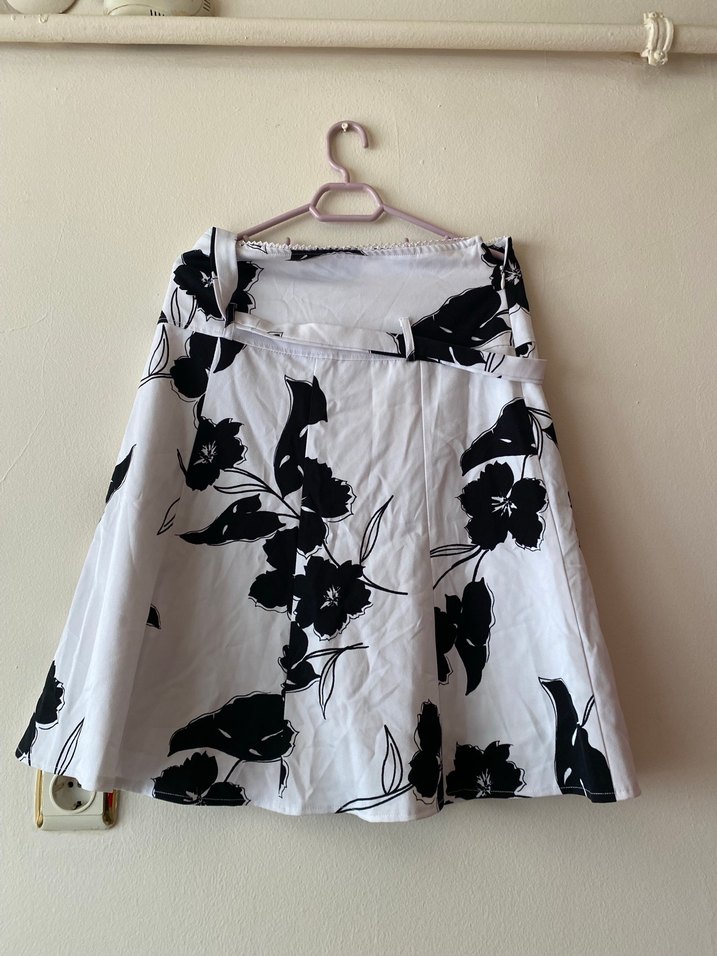 Pamuklu kumaştan, siyah çiçek desenli, pilili ve bol kesim midi hamile eteği. Günlük kullanıma uygundur.
