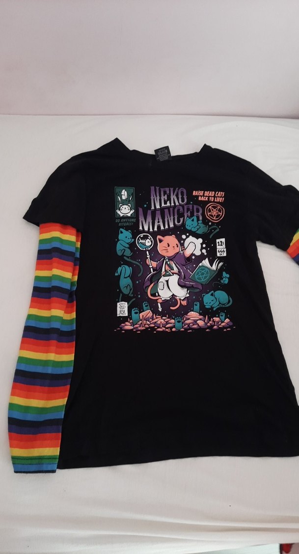 Pamuklu, baskılı ve uzun kollu bu hamile tişörtü, renkli gökkuşağı desenli kollara ve pop kültür baskısına sahiptir. Günlük kullanım için uygun, fitted kesim ve bisiklet yaka içerir.