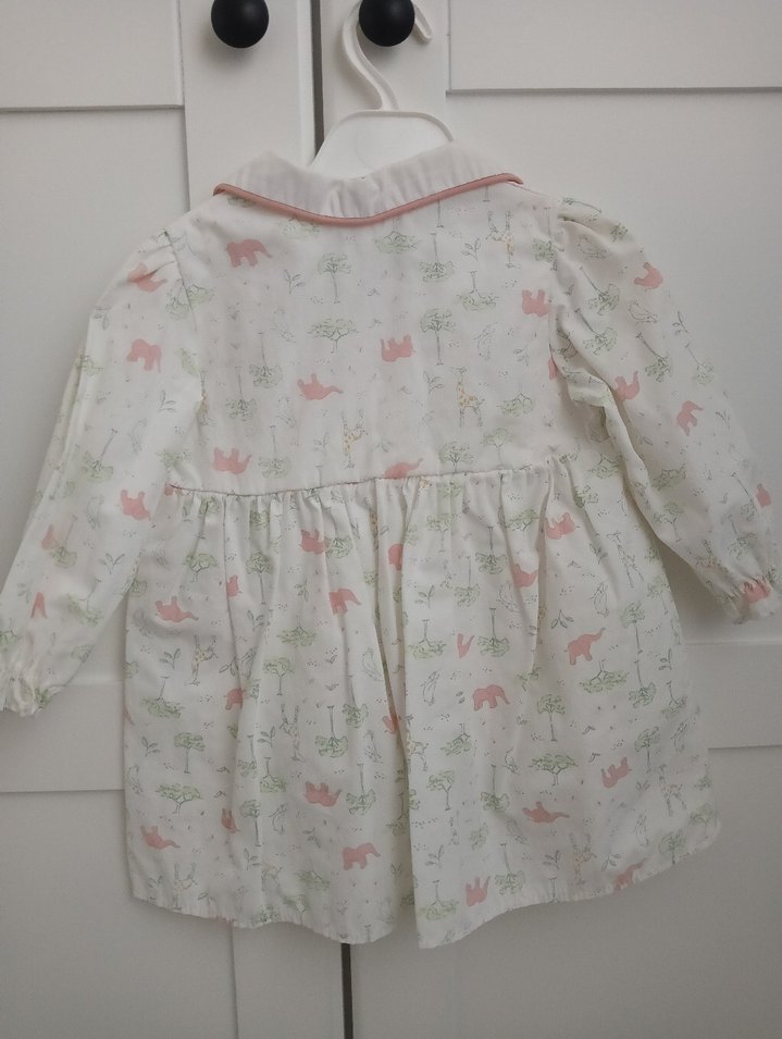 Pamuklu, uzun kollu, yakalı ve düğmeli rahat kesim kız elbisesi. Pastel tonlarda baskılı vintage tarzda tasarlanmıştır.