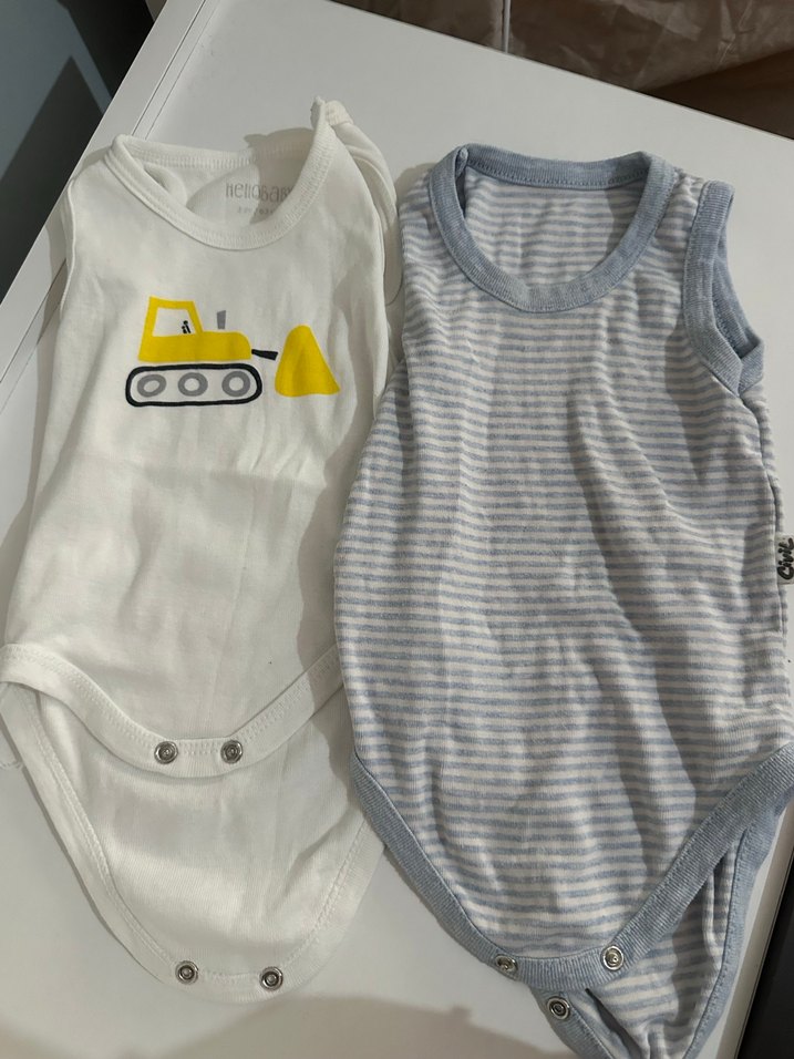 Pamuklu, askılı bebek body seti, biri iş makinesi baskılı beyaz, diğeri gri çizgili. Kolay giydirme için çıtçıtlı.