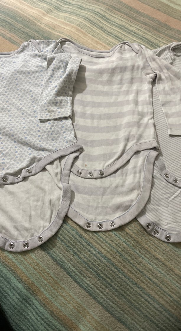 Yumuşak pamuktan yapılmış, uzun kollu bebek body. Yuvarlak yakalı ve kolay giydirme için çıtçıtlıdır. Rahat ve sade tasarım. Next markası baya kullandık o nedenle kusurları var minik leke gibi birinde minik belli olmayan delik.Hepsinin fiyatı.kumaşı kaliteli,yurt dışından gelmişti.Hepsi de 18-24 ay için uygun.