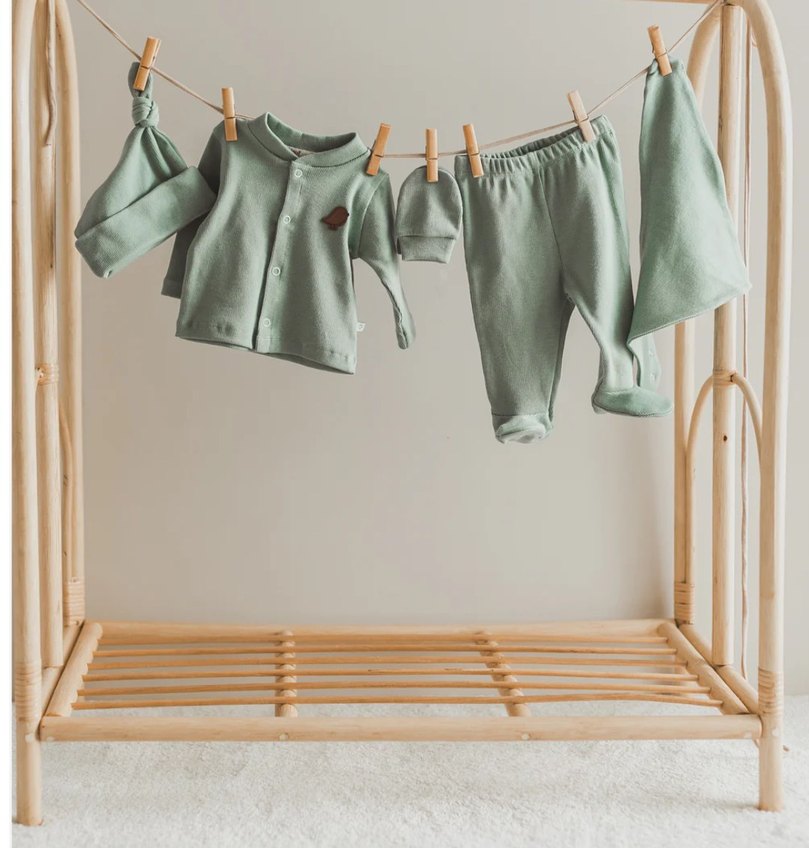 Pastel yeşil renkli, çıtçıtlı ve uzun kollu pamuklu bebek hastane çıkışı seti. Üst, pantolon, eldiven ve şapka, önlük içerir, kaşkorse kumaştır. %95 pamuk % 5 likradır.