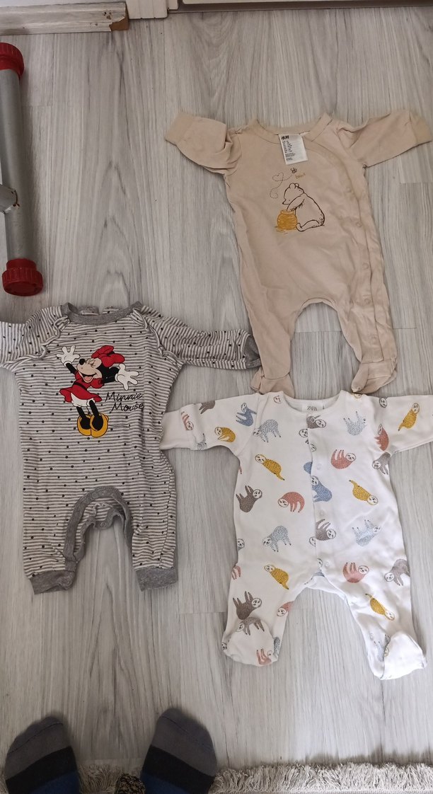 hm ve zara tulumlar Pamuklu, uzun kollu ve ayaklı üç bebek tulumu, nakışlı ve baskılı desenlerle gri ve nötr tonlarda.