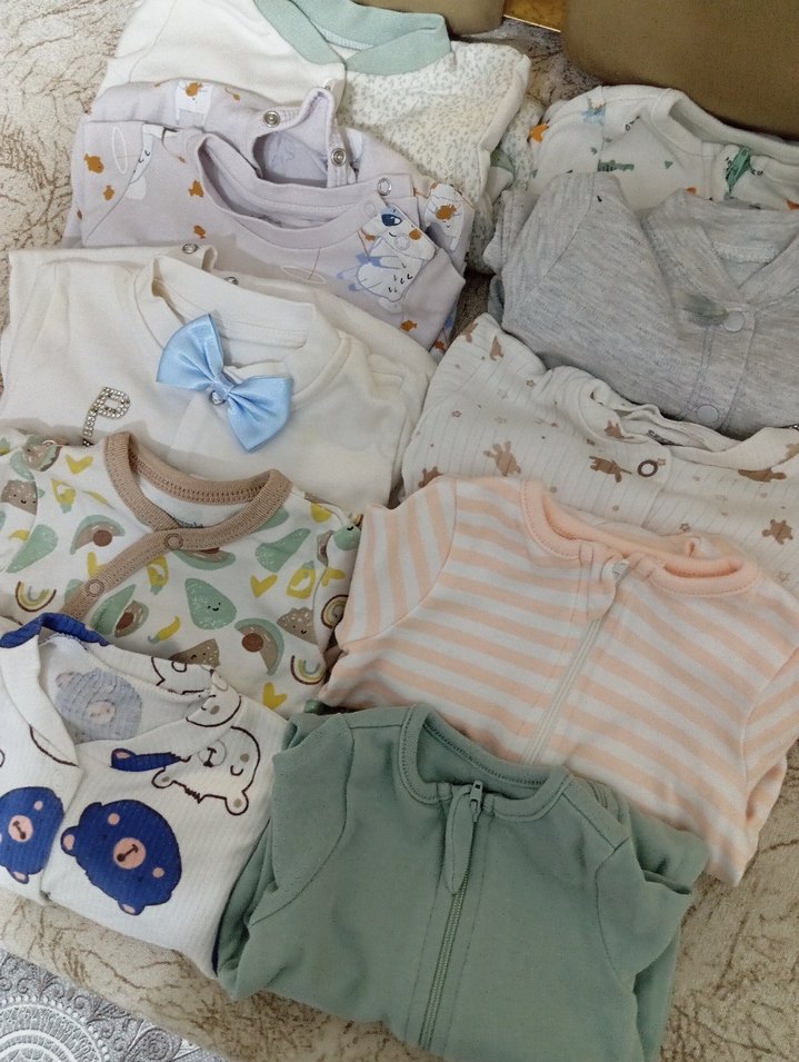 Yumuşak pamuktan yapılmış, uzun kollu ve ayaklı, pastel tonlarda üç bebek uyku tulumu seti. Beyaz ve açık renk desenlerle bebekler için rahat uyku sağlar.
