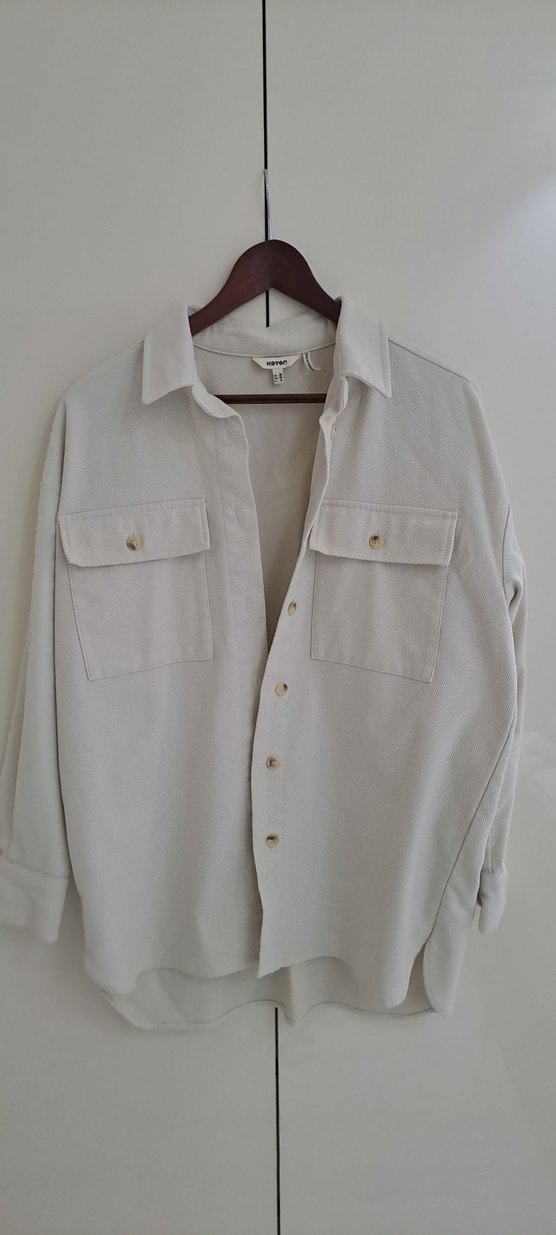 Yumuşak pamuklu kumaştan, düğmeli, cep detaylı, bol kesim uzun kollu bej kadın gömlek. Günlük sokak tarzına uygun rahat bir model.