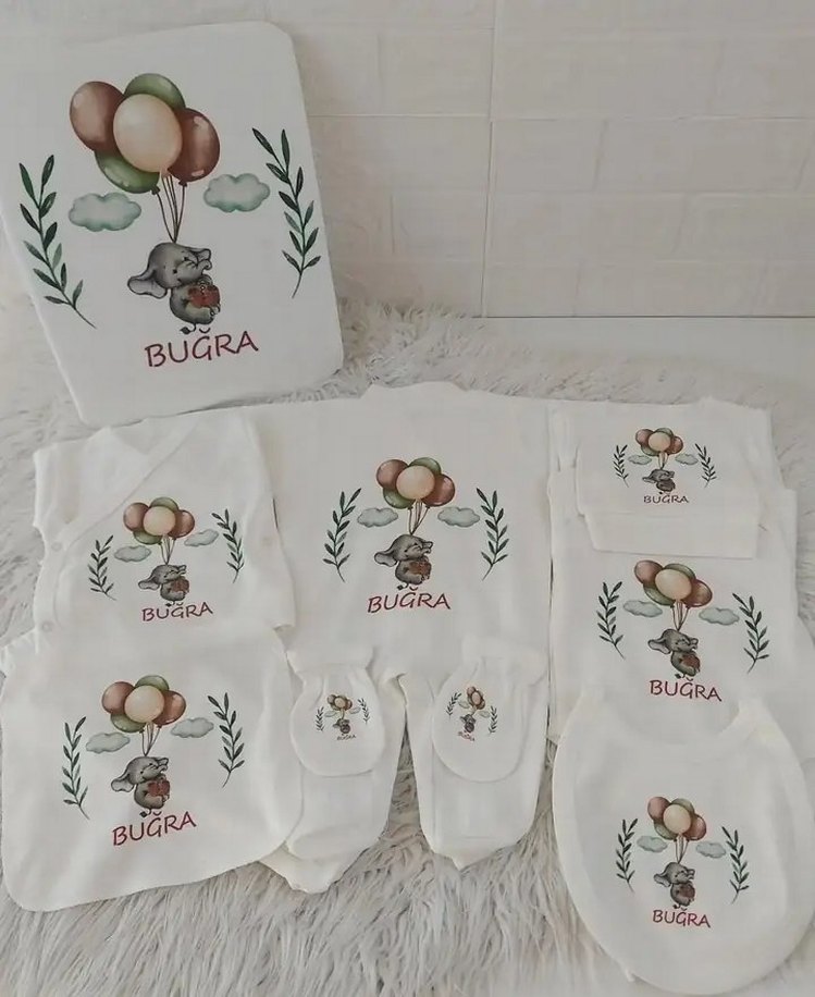 Pastel renkli balon ve hayvan baskılı, pamuklu beyaz bebek uyku seti. Üzerinde "BUGRA" ismi yer alır. isme özel hastane çıkış seti hazırlanma süresi kargo ile beraber 10 gündür ona göre sipariş veriniz TULUM ELDİVEN ŞAPKA YASTIK (40X35 Kılıftır) BATTANİYE (90X85) DIŞ ZIBIN ÇITÇITLI BODY İÇ ZIBIN PANTOLON ÖNLÜK MENDİL