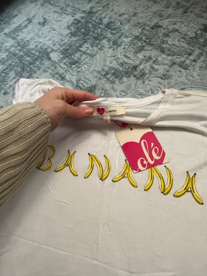 Pamuklu, uzun kollu, beyaz hamile gömleği. Bol kesim ve yuvarlak yakalı, muz baskısı ve düğme detaylı. Günlük kullanım için rahat.