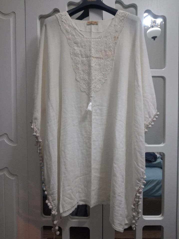 Pamuklu beyaz, bol kesim bluz. Nakışlı, kısa kollu ve yuvarlak yakalı. Kenarlarında ponpon detayları bulunur. Rahat ve hafif, gündelik kullanım için uygun.