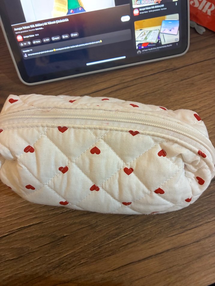 Pamuklu, beyaz renkte, küçük kırmızı kalp desenleriyle kapitone dokulu, fermuarlı makyaj çantasıdır. Bohem tarzı ve günlük kullanıma uygun. ❤️