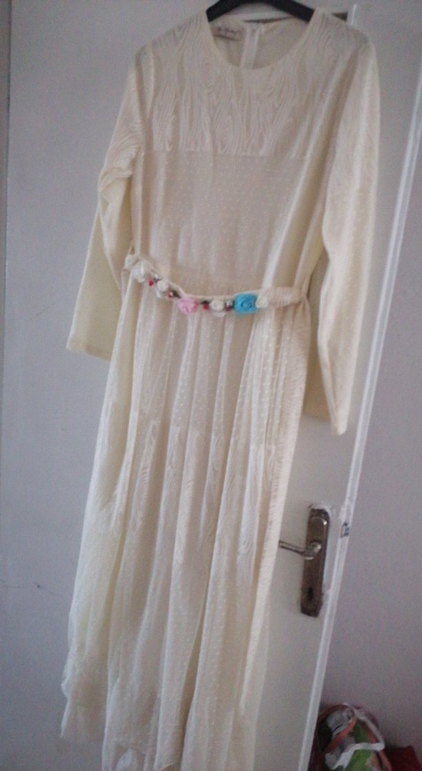 Pamuklu beyaz elbise, bol kesim ve dökümlü tasarıma sahip. İp askılı kol ve yuvarlak yaka detaylı, pastel çiçekli kemerle tamamlanmış. Nikahta 2 saat giyildi