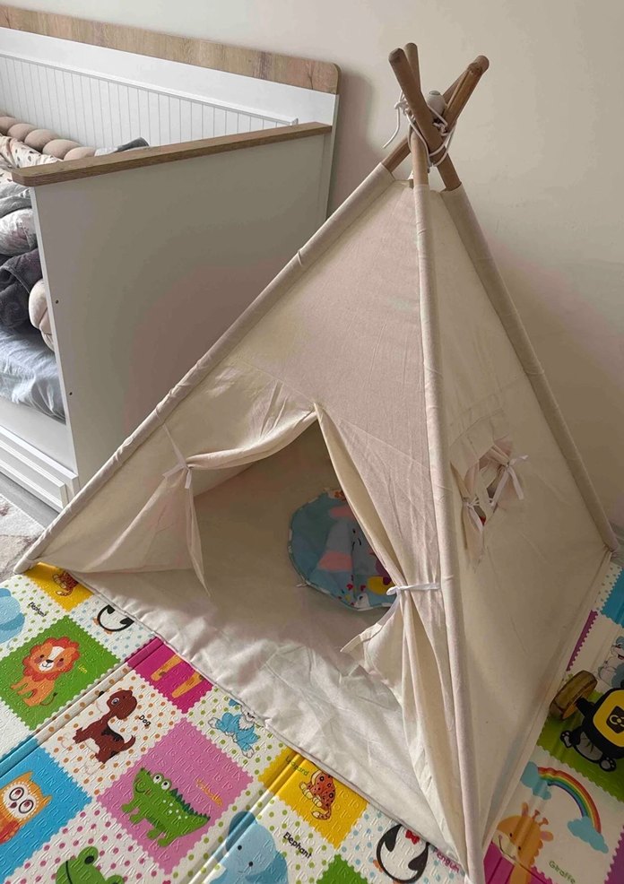 Pastel renklerde pamuklu, beyaz teepee çadır şeklinde çocuk oyun matı, rahat bir oyun alanı sağlar.