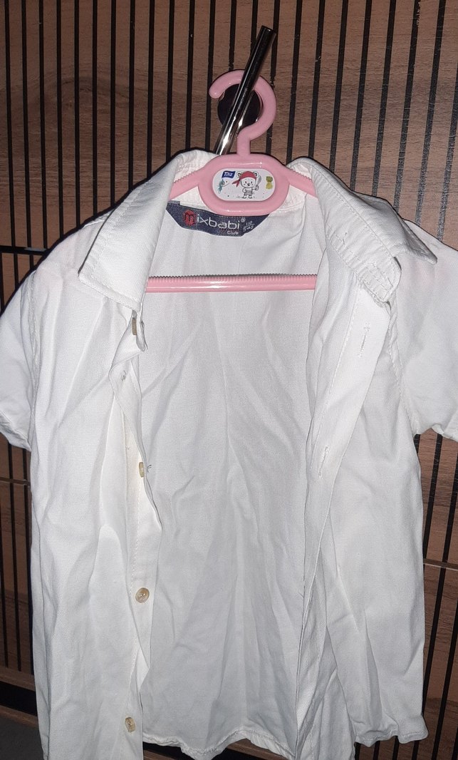 Pamuklu, düğmeli, kısa kollu beyaz gömleği. Normal boyda ve dar kesimdir, günlük kullanıma uygundur. 3 4 yaş . sorunsuz.