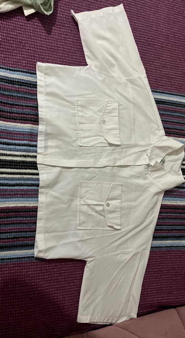 Pamuklu beyaz gömlek, kısa kollu ve düğmeli tasarıma sahip. Bol kesimi ve önündeki iki cepli detayıyla günlük kullanıma uygundur.