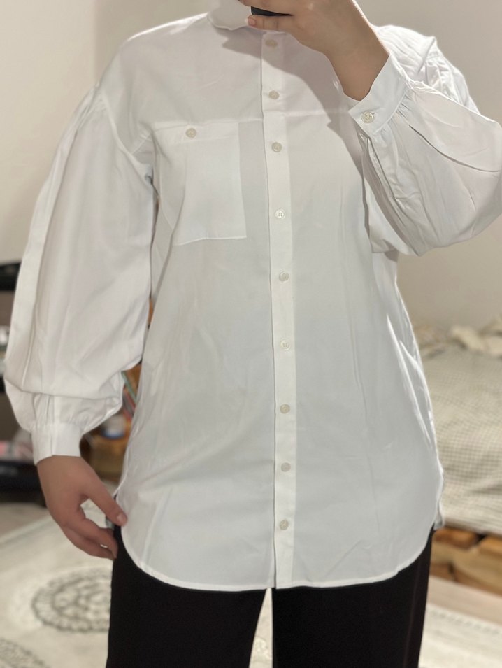 Pamuklu beyaz gömlek, düğmeli, uzun kollu ve yakalıdır. Salaş kesimiyle gündelik sokak stiline uygundur. Defosu yoktur herhangi bir lekesi yoktur Oversize değildir  üzerimde resmi vardır  66 kiloyum boyum 167 cm