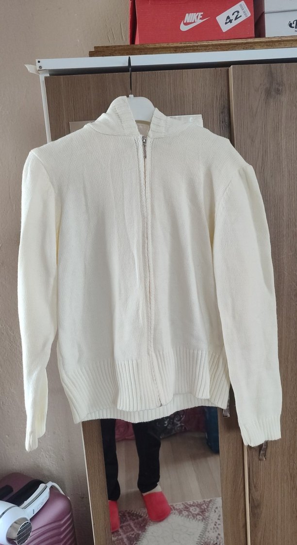 Pamuklu, beyaz renkli, yüksek yakalı ve uzun kollu hamile hırkasıdır. Rahat kesimi ve fermuar detaylı, günlük rahat stil için uygundur.