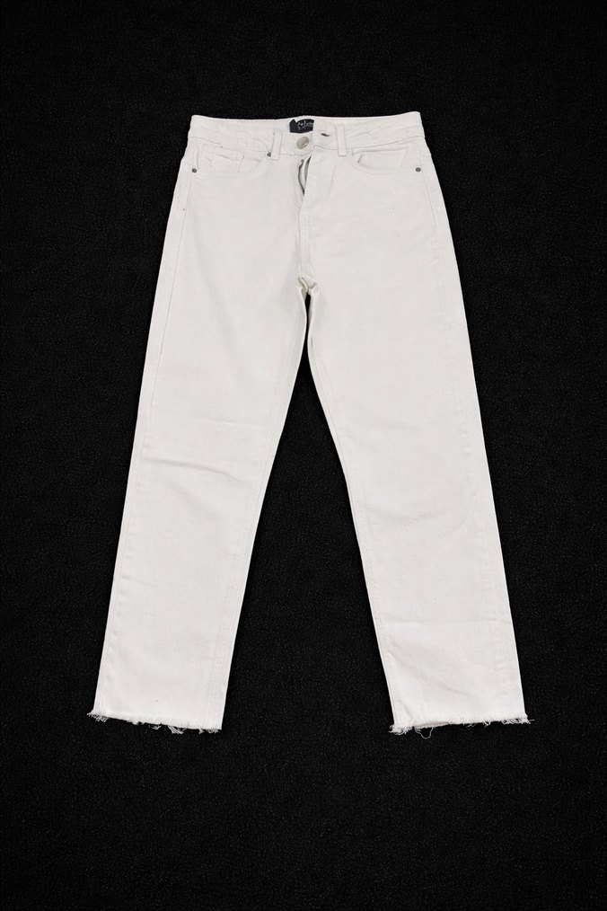 Düğmeli, pamuklu, normal boy midi uzunlukta, sade beyaz kadın pantolonu. Günlük ve sokak stili için uygundur.