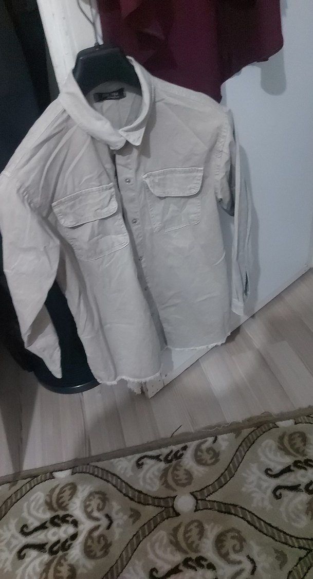 Pamuklu kumaştan, düğmeli ve yakalı, uzun kollu beyaz gömlek. Salaş kesimi ve kısa boyuyla günlük sokak stili için uygundur. iki göğüs 44 45 uzunlugu 64santim