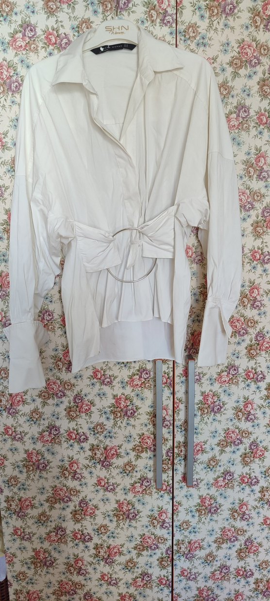 Pamuklu, kuşaklı bel detaylı, salaş kesim beyaz kadın gömleği. Uzun kollu, halter yaka, bohem ve Paris esintili günlük stil sunar. Biraz kırışık görünüyor ama ürün temizdir hiçbir deformesi yoktur.