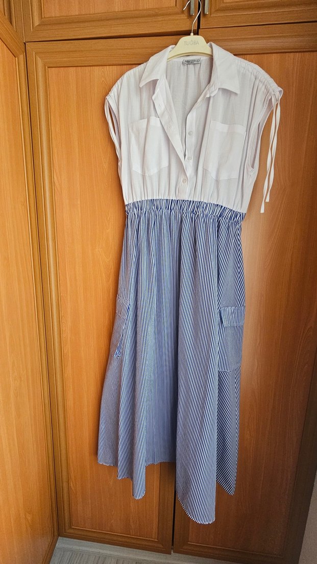 Pamuklu, çizgili, beyaz renk uzun ve bol kesim şık, günlük rahat kullanım için uygundur. hiç giyilmemiş olup etiketi mevcut değildir. fullamoda nın