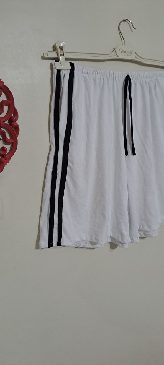 Pamuklu, bol kesim beyaz mini şort, siyah yan çizgiler ve pile detaylarıyla spor aktiviteleri için uygundur. Rahat ve sade tasarım.