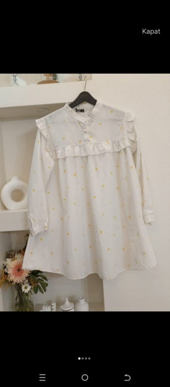 Pamuklu, uzun kollu, beyaz renkli, nakışlı pastel desenli, fırfır detaylı, bol kesim bohem stil tunik. gömlek