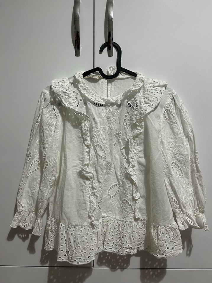 Pamuklu, nakışlı beyaz bluz, yakalı ve fırfırlı detaylara sahiptir. Uzun kollu, bol kesim ve bohem tarzındadır, günlük kullanım için uygundur.