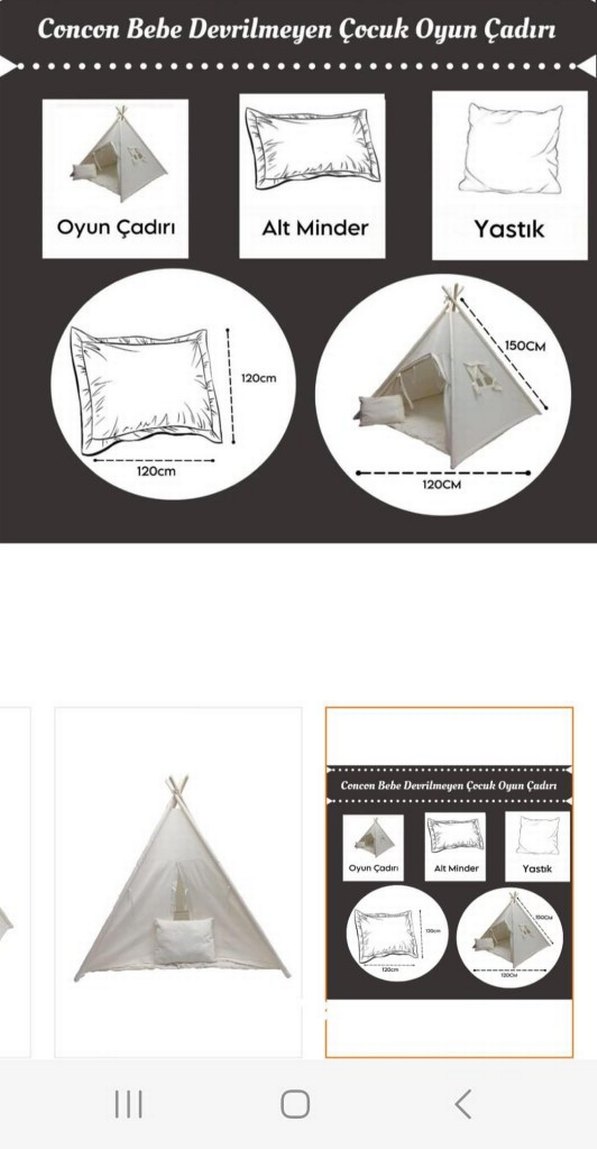 Pamuklu beyaz oyun çadırı, yastık ve 120x120 cm ölçülerinde alt minderden oluşan set. 150 cm yüksekliğe sahiptir. Çocuk oyunları için uygundur. ️