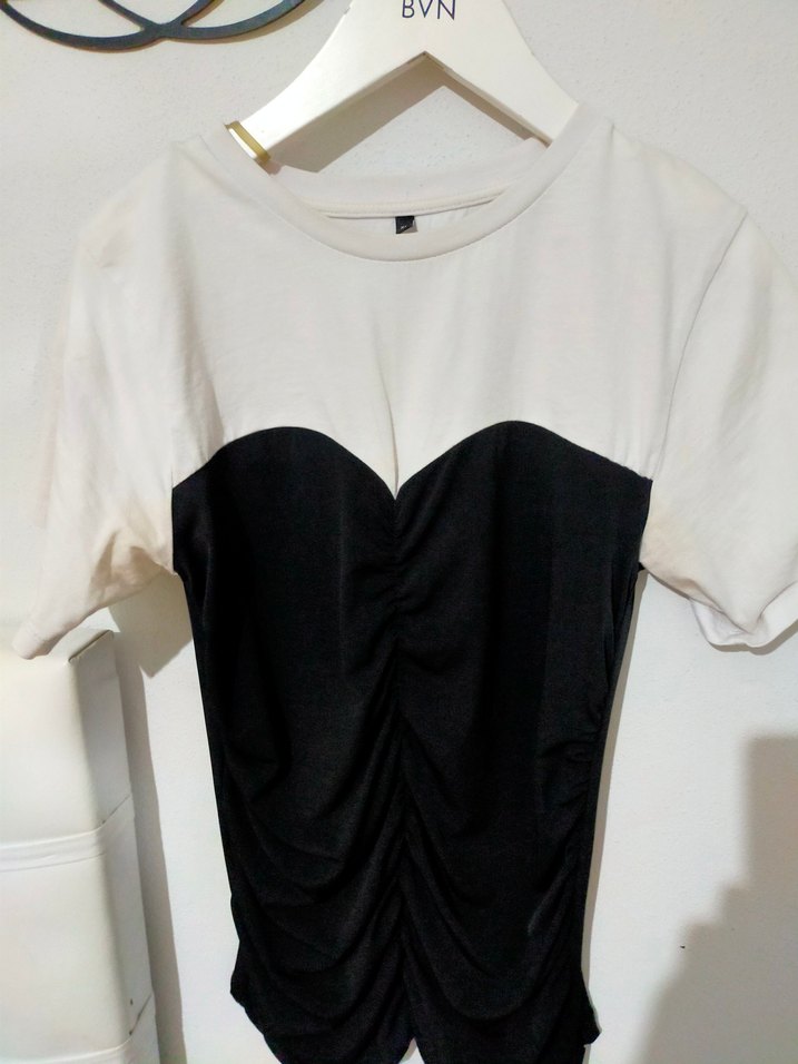 Pamuklu, kısa kollu, bisiklet yaka, vücuda oturan hamile tişörtü. Koyu renkli baskılı ve pileli detaylara sahip, sokak modası tarzında günlük kullanım için uygun.