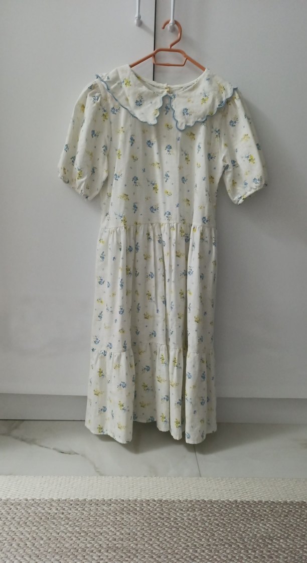 Pamuklu, beyaz uzun elbise, bol kesim ve kısa kolludur. Fırfırlı yakası ve ince çiçek deseniyle vintage, bohem tarz sunar.