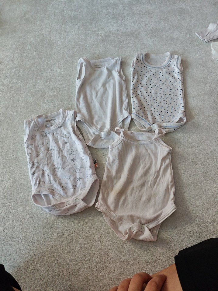 Erkek bebekler için beyaz ve gri tonlarda, kolsuz pamuklu atlet bodysuitler. Askısız yaka ve sade desenlerle normcore tarzda rahat.