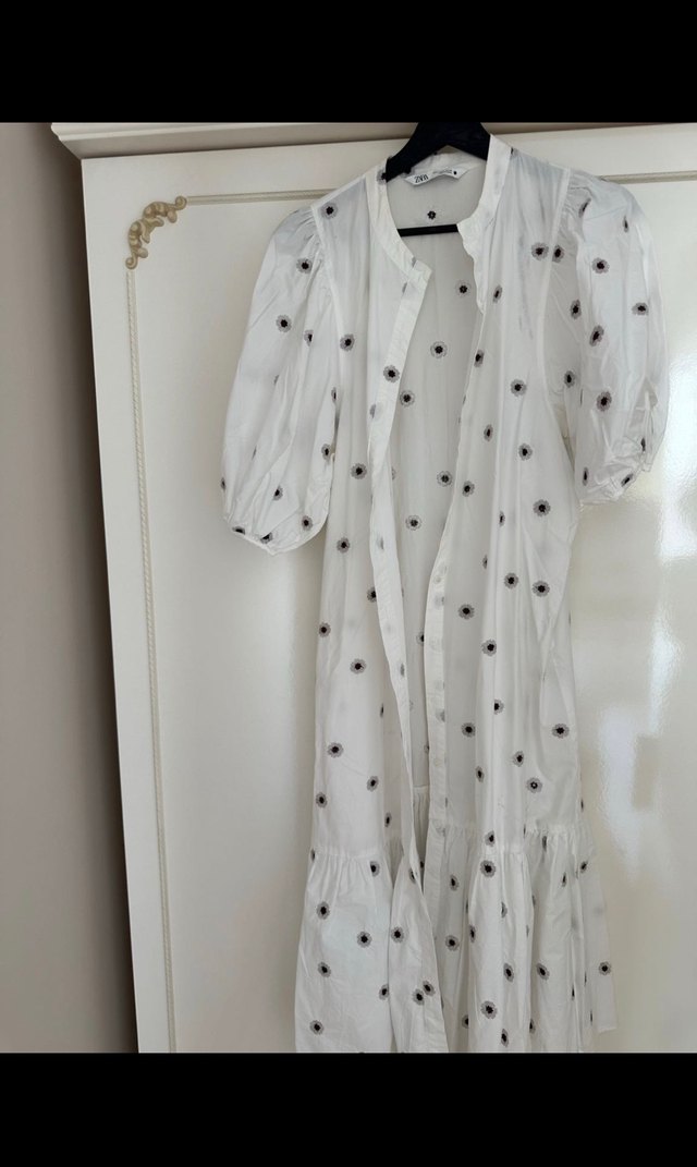 Pamuklu, bol kesim, kısa kollu, yakalı ve düğmeli uzun elbise. Gri nakışlı, bohem Paris tarzını yansıtıyor.