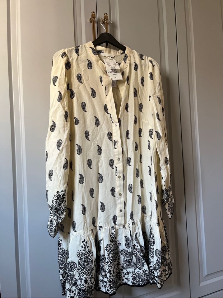Pamuklu, düğmeli, uzun kollu ve V yakalı bol kesim tunik elbise Beyaz ve gri baskılı desenlerle rahat kullanım sağlar.