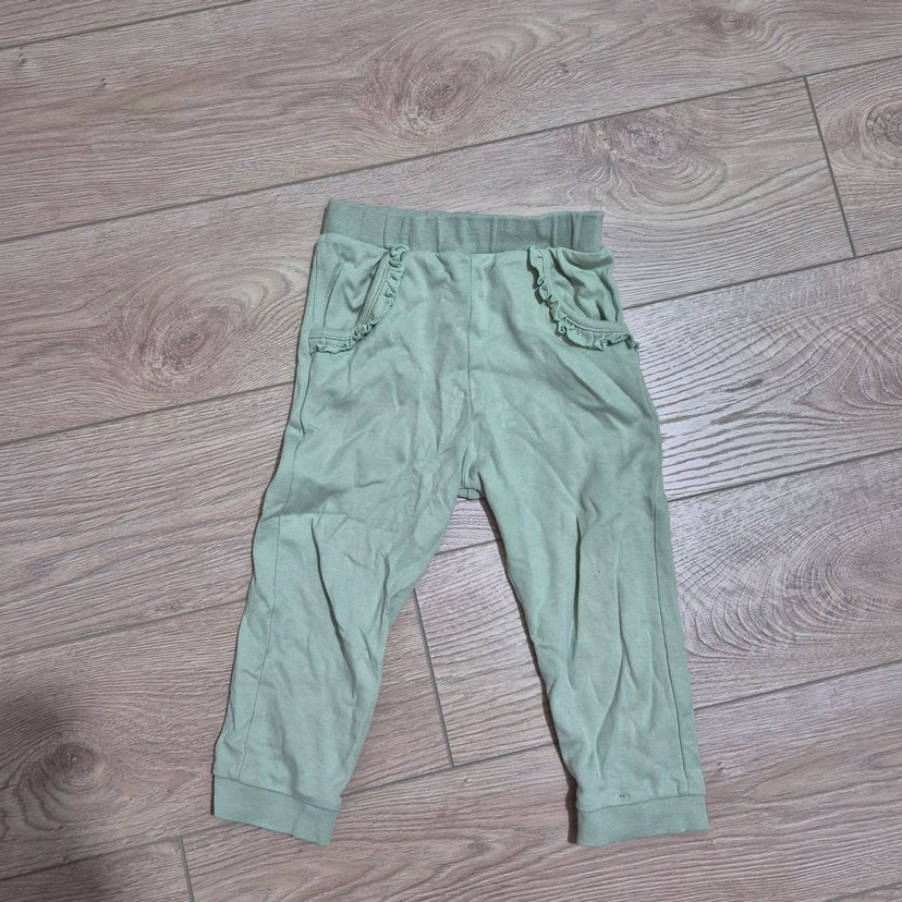 çocuklar için ceplerinde fırfır detaylı, bol kesim yeşil pamuklu pantolon. Rahat ve yumuşak kumaştan, trend sokak stili için uygun.