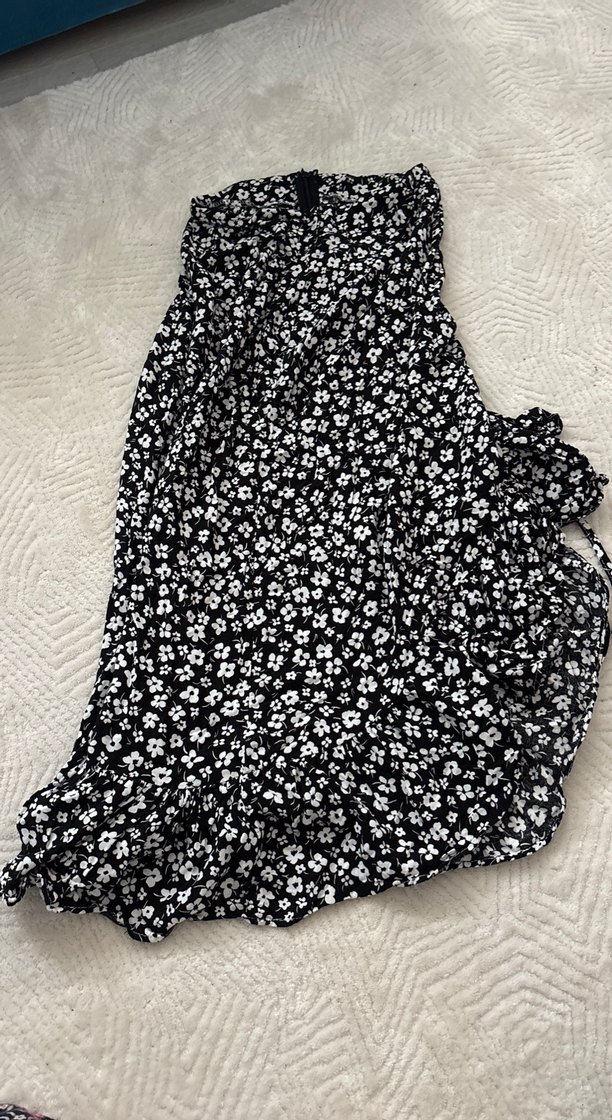 Pamuklu, siyah uzun eteği, bol kesim ve fırfır detaylı, çiçek desenlidir, günlük kullanıma uygundur.