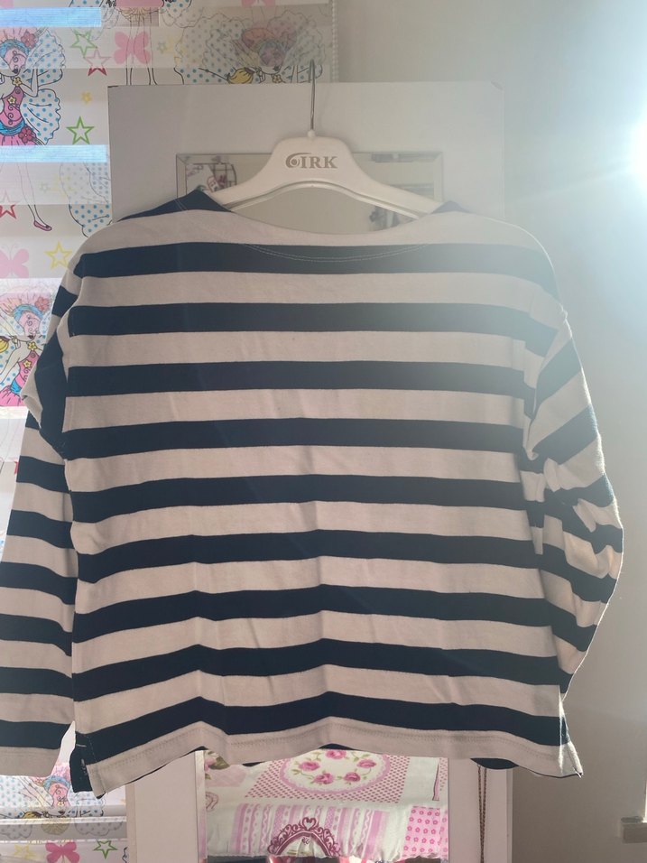 Pamuklu, çizgili, uzun kollu ve yuvarlak yakalı hamile bluzu, rahat kesimi ve örme dokusuyla günlük kullanıma uygundur. Optik karakter tanıma: "GIRK".