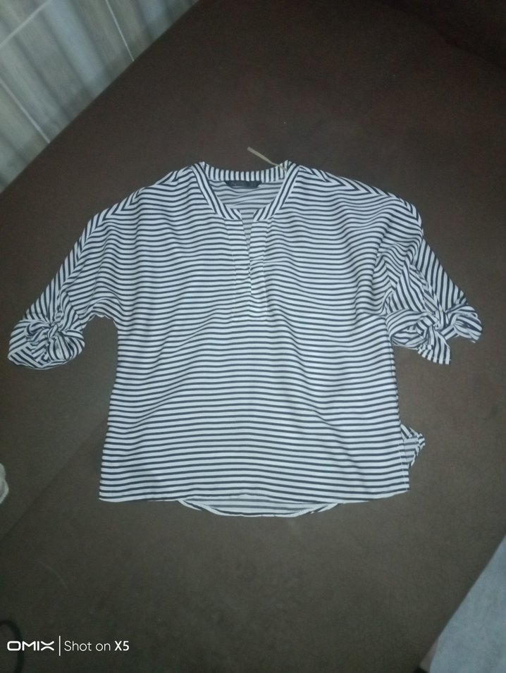 Pamuklu, beyaz ve Siyah çizgili, kollu, rahat kesim kadın gömlek. Günlük kullanıma uygun, midi uzunlukta.