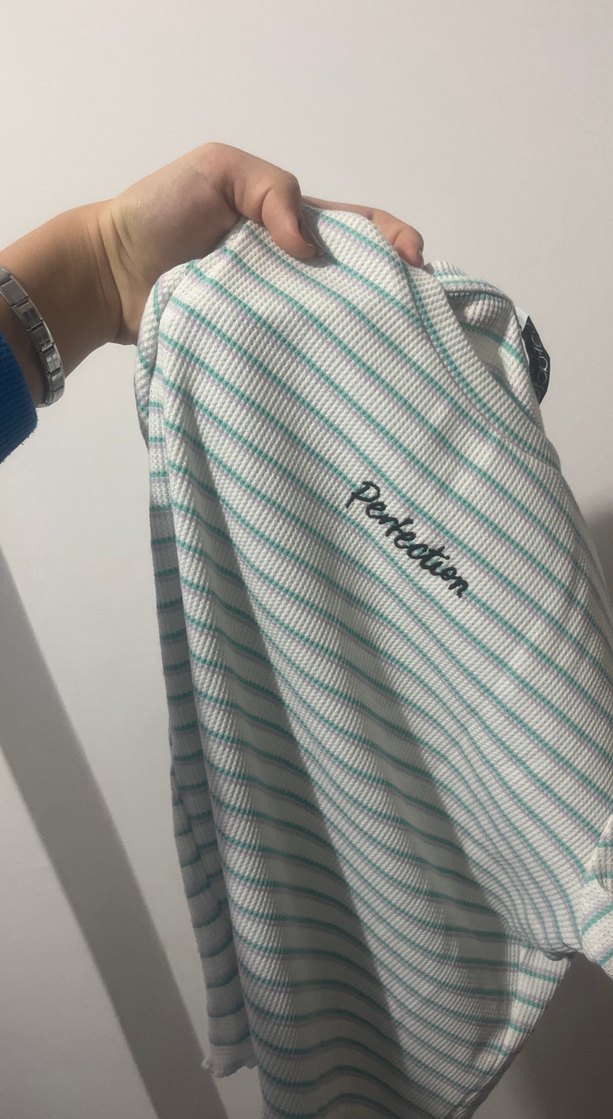 Pamuklu, kısa kollu ve bisiklet yaka tişörtü, pastel çizgili ve 'Perfection' baskılıdır. Günlük kullanıma uygundur.
