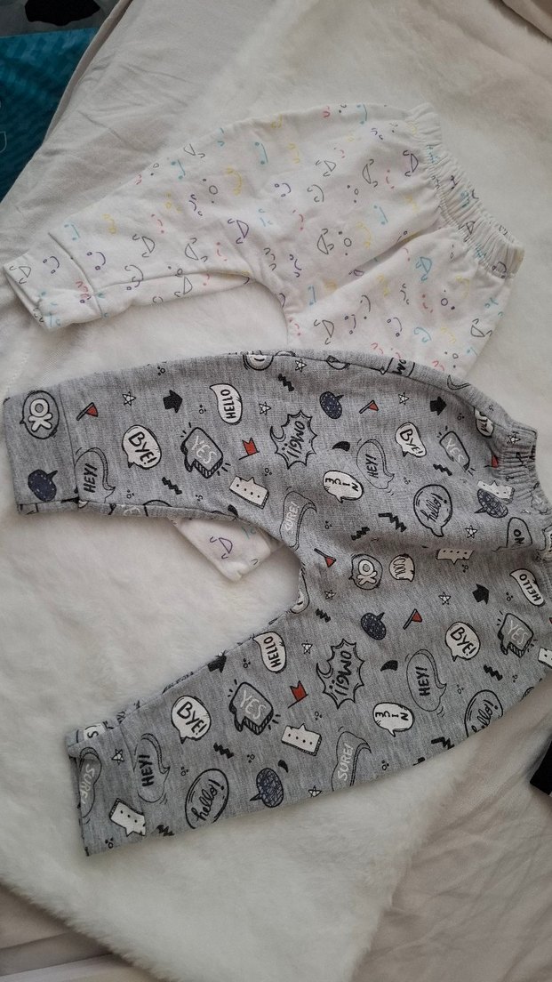 Pamuklu, baskılı desenlere sahip gri ve beyaz iki adet çocuk pijama altı. Rahat oturması için lastikli bel bandı bulunur.
