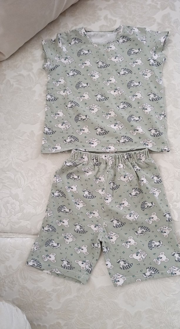 Pamuklu, yeşil renkli, baskılı kumaştan kısa kollu üst ve şortlu çocuk pijama takımı. Rahat uyku için uygundur.