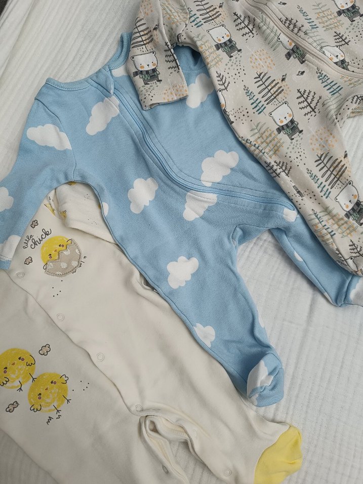 Pastel renklerde, pamuklu kumaştan yapılmış, bulut, hayvan ve ağaç desenli çocuk uyku tulumu seti.