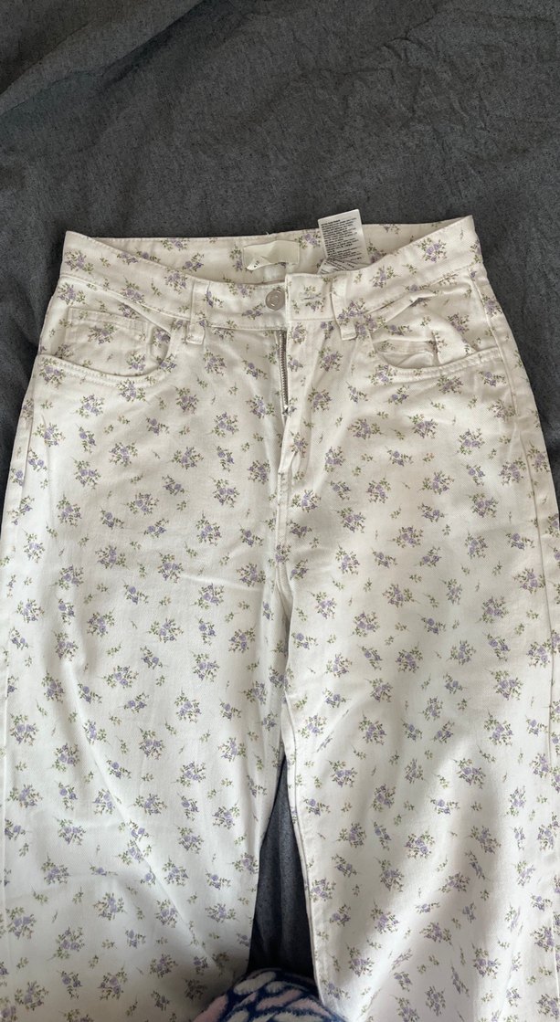 Pamuklu, düğmeli ve bol kesim beyaz pantolon, hafif çiçek desenleriyle günlük rahat kullanım için uygundur.